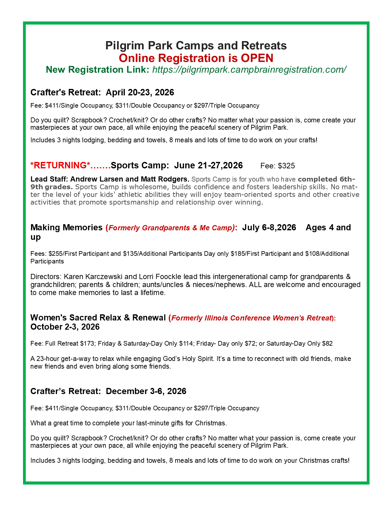 Whether you are looking for a day meeting, a youth group outing, or an adult retreat weekend, Pilgrim Park has the perfect facilities for you. Our 150 acres is made up of sports fields, hiking trails, a pond, and a labyrinth, all displayed in our beautiful natural surroundings.